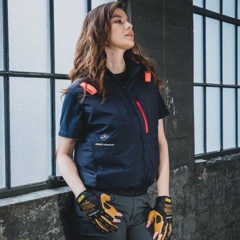 ギミックの効いたレッドファスナーポケットを施したハイバックファンモデルが様々なワークシーンでのパフォーマンス性をアップ