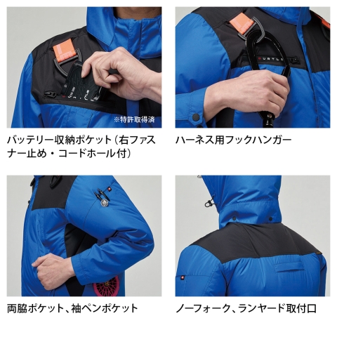 フルハーネスに対応した本格ワークスペックモデルながら、カジュアルなマウンテンパーカーデザインはワークシーンからデイリーまで幅広いシーンをフォロー
