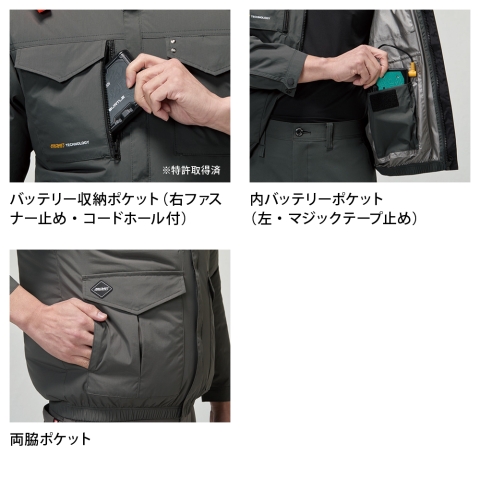 フルハーネス、安全ベスト、ショルダーなど様々なワークギア装着時にファンとの接触を軽減するミルスペックな多機能ポケットを配備するハイバックファンモデル